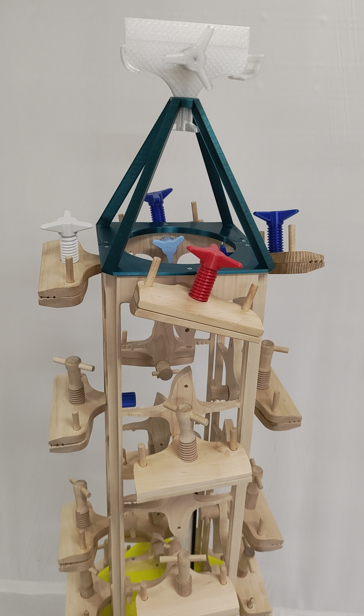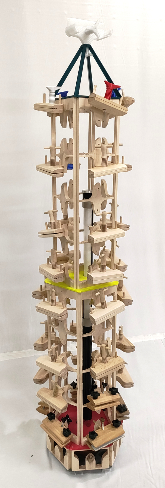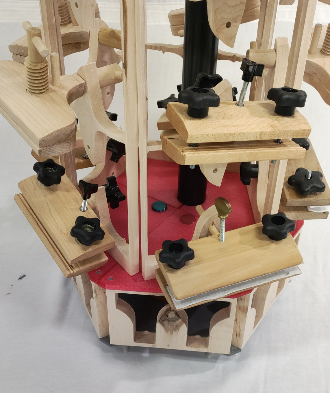 There are 37 clamps mounted on a frame made of the off-cut boards from making the clamps. Many more boards and clamps were consigned to the fire pit. The level interfaces were custom designed and 3D printed.