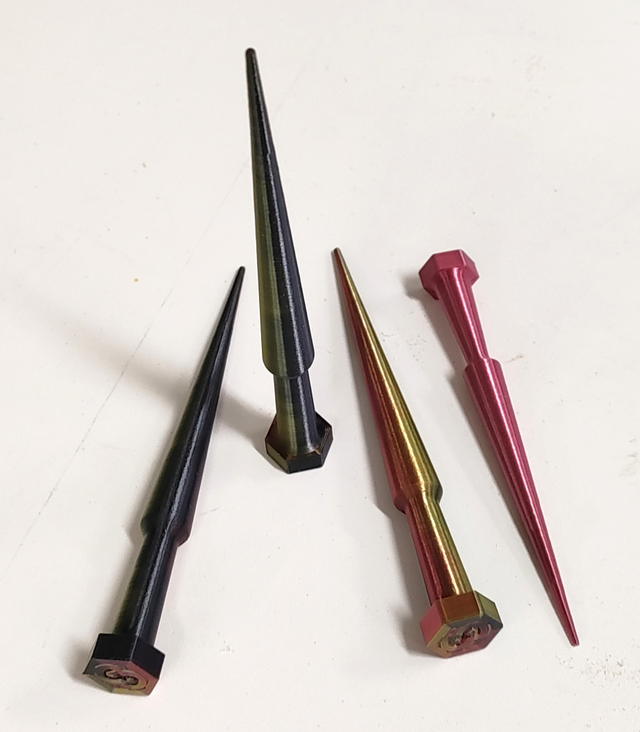 The history starts at the bottom with the very first clamp I made for Jayne. At the top is an all-3D printed one that was a proof of concept. The central light pole is one that I made in the late 1970s.