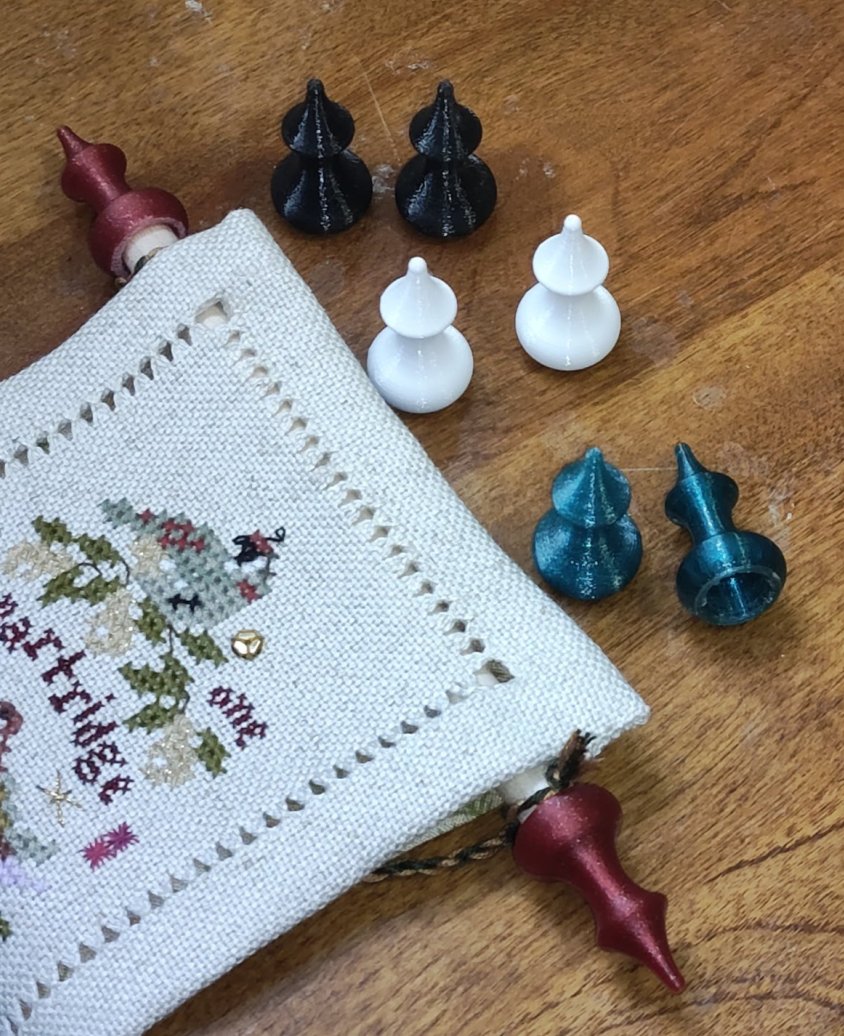 When your work is complete, you may wish to hang it on a dowel. Now you can close off the ends with custom-printed, attractive finials! These fit snugly on a standard 3/8 inch (9.5 mm) wooden dowel. Your hanging loop will stay in place at the edges of your art piece.